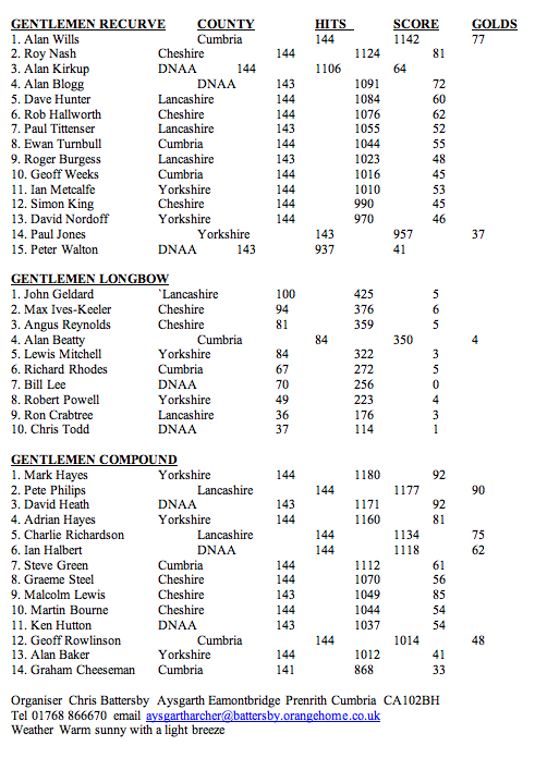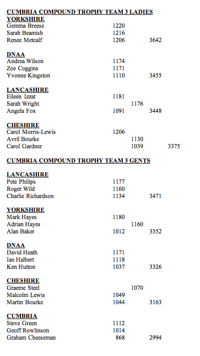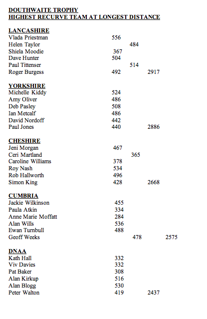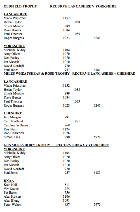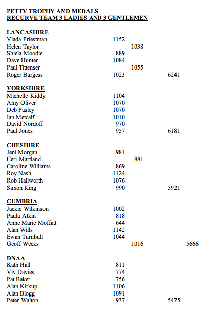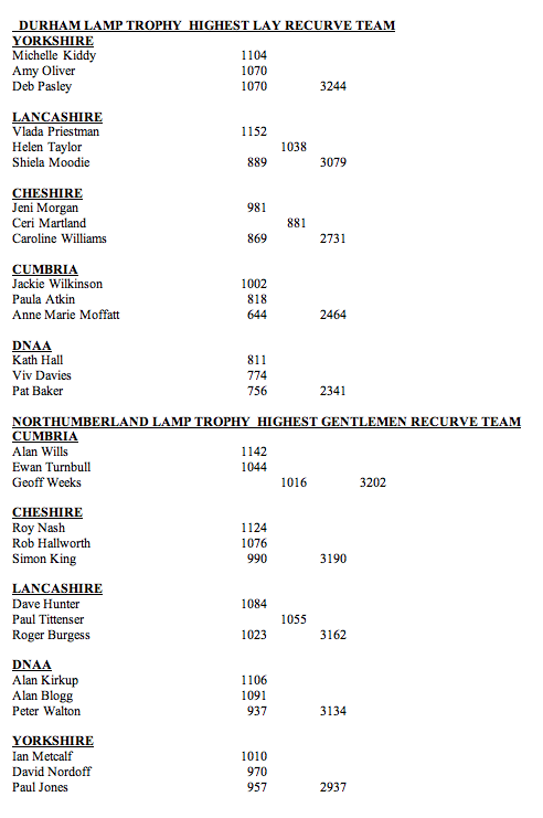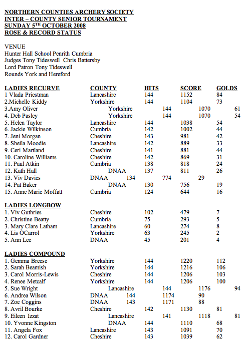 | Lancashire Archery Association Report on the Five Counties Match at Penrith 5th October 2008 Yorkshire : Cheshire : Lancashire : Durham-Northumberland : Cumbria The ground was sodden, but the weather kind to us: cold, with a slight breeze but the Sun shone all day. As the day progressed it was difficult to see how we – or anyone else for that matter – were doing as there was no leader board... The team battled on, and generally things went smoothly. After finishing the shoot we retired to the school main hall for soup and a roll before beginning our journeys home. There was a hive of conversation with everybody still unsure how their score had finished up and whether their team had done the job. I may say that even before the results the performance of the Lancashire team was never in doubt in my mind, and I thank everyone who took part. The time came for the results. We all sat with baited breath – none worse than myself because I felt that we deserved something for our efforts. Well, even though one of lady recurves had experienced a bit of bother with the bow... The Lancashire recurve team won the overall competition, which led to us winning